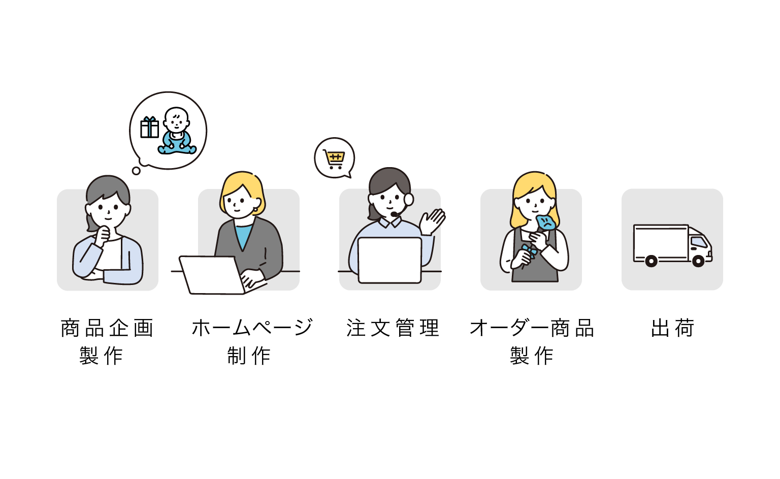 私達は、最近のオンライン通販企業においては珍しく すべての業務を自社で行っています。 それは、私達がメーカーであり小売業であることで お客さまの要望を的確にとらえ “あったらいいな!”を オリジナリティの高い商品・サービスとして できるだけ早くお届けして行きたいと考えているからです。