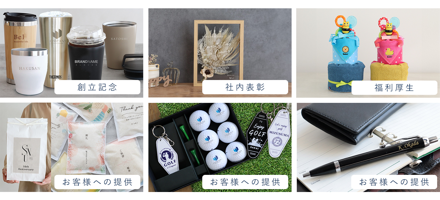 会社の創立記念・従業員様の御誕生日などの福利厚生や営業表彰や退職祝い。お店の開店祝いや開業記念のお祝い、また、お客様への契約お礼の記念品やノベルティなど様々な用途でご依頼をいただいております。